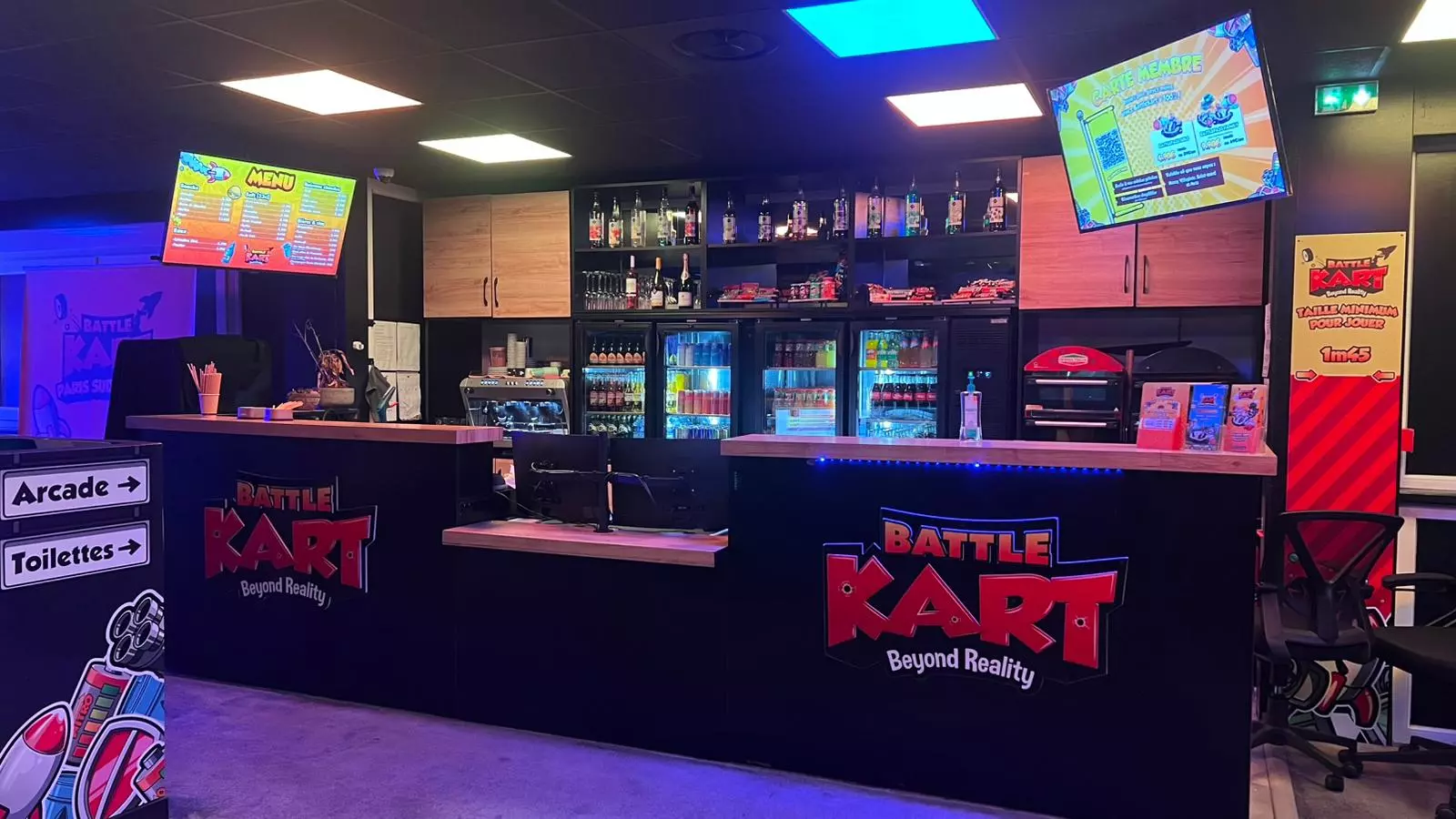 BattleKart is above all a concentrate of emotions, sensations and fun accessible to all (from 1.45m)! You drive real electric karts on a track with no physical obstacles, but through virtual worlds We use a large number of projectors fixed to the ceiling of our hall to project different circuits and game modes onto the floor. Your kart is equipped with sensors and on-board electronics so that the karts interact with the elements on the track and with each other. For example, pick up a bonus square on the ground and a rocket will appear on your dashboard. Press the yellow button and the rocket will shoot off in front of your kart. If it hits one of your opponents, they’ll be slowed down for a few seconds and you’ll be able to overtake them!